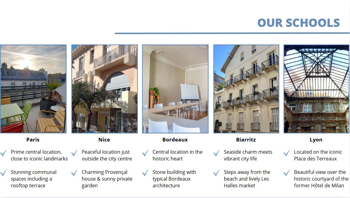 International House English programmes – Les Ateliers FL Paris, Nice, Bordeaux, Biarritz and Lyon are now part of the International House network and offer English programs for any age: https://ih.fl-france.com